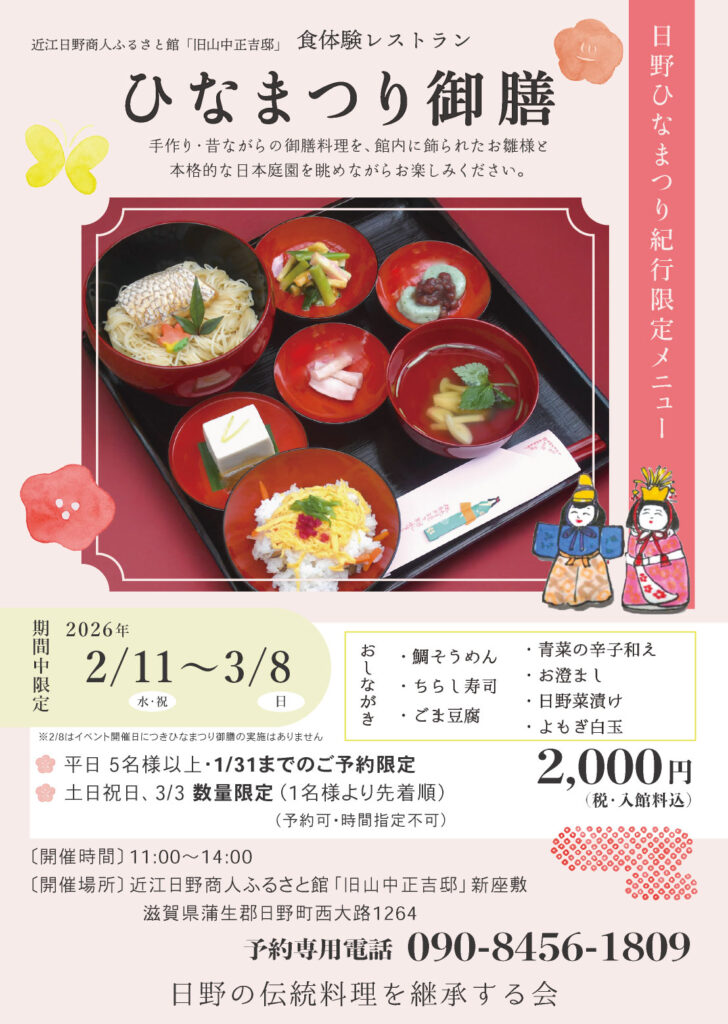 近江日野商人ふるさと館「旧山中正吉邸」食体験レストランでは、2026年2月8日(日)〜2026年3月8日(日)に日野のまちなか一帯(大窪・村井・西大路)で開催されるひなまつり紀行にあわせて 《ひなまつり御膳》 をご提供します。